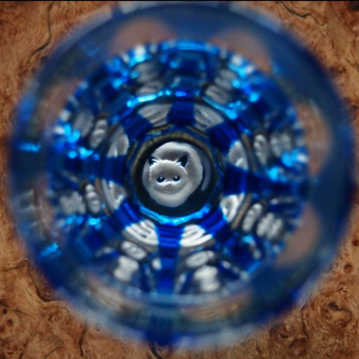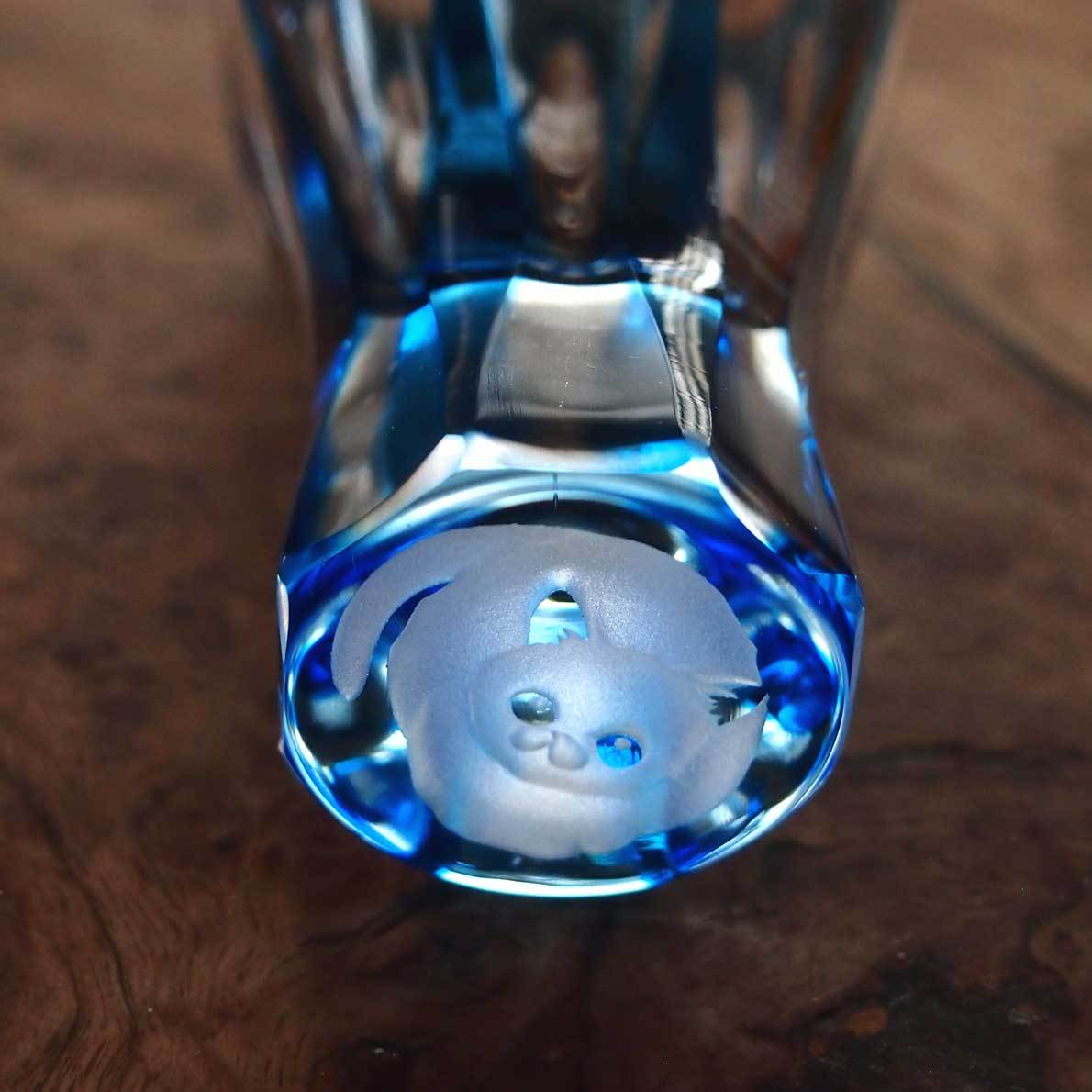 底にはこちらを見上げている猫の姿をサンドブラスト彫刻しています。
