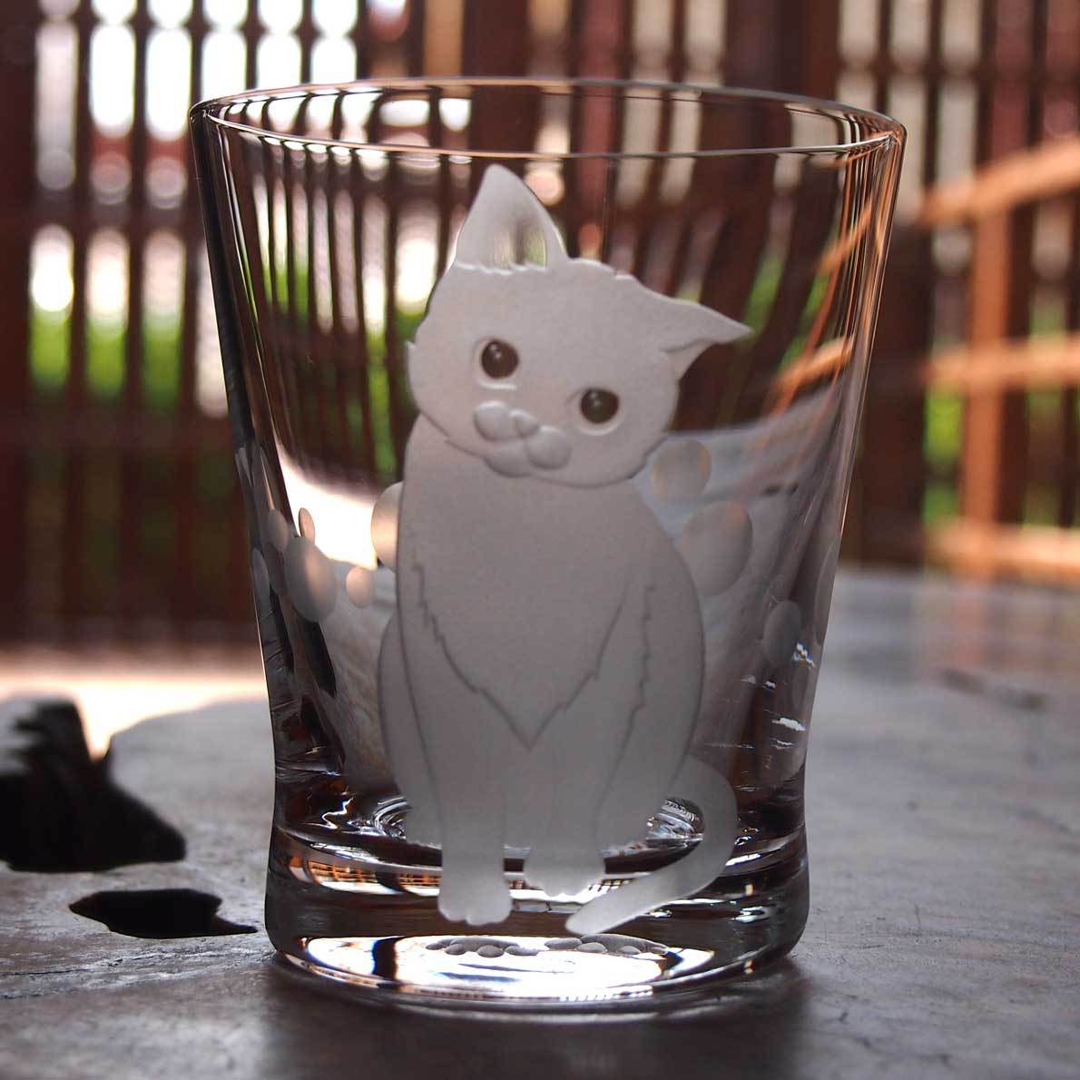 ちょっと首を傾げてなにか言いたげな猫のロックグラス。