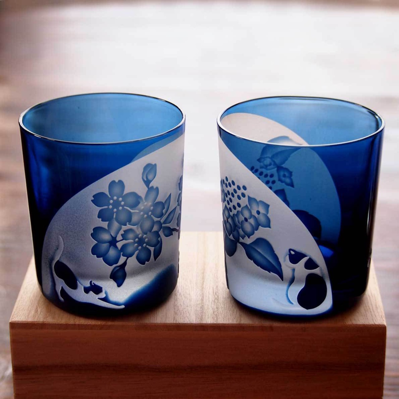 ペア猫ロックグラス~「桜と紫陽花」は、可愛らしい猫のイラストが描かれたおしゃれなロックグラスです。桜と紫陽花の花々が描かれたデザインは、和風テイストとモダンな要素が融合したアート作品のよう。お酒を楽しみながら、芸術的な時間を過ごしてみてはいかがでしょうか。