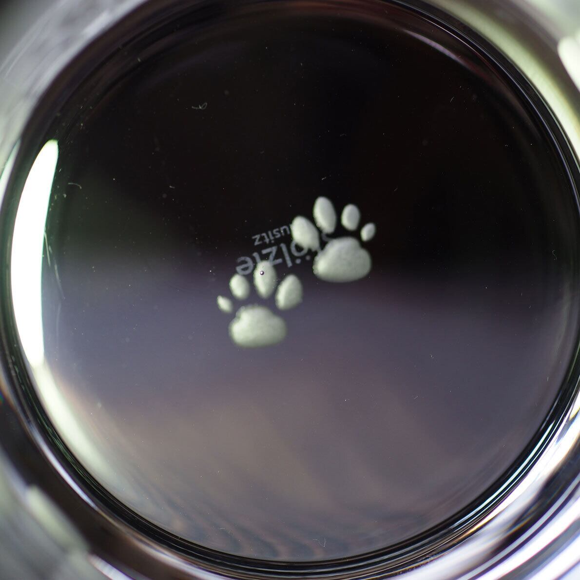 手作りのクリスタル製ロックグラス。桜の下で白い犬が優雅に描かれている。