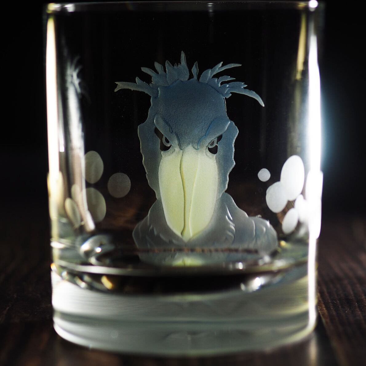 ハシビロコウを彫刻したクリスタル・ロックグラス