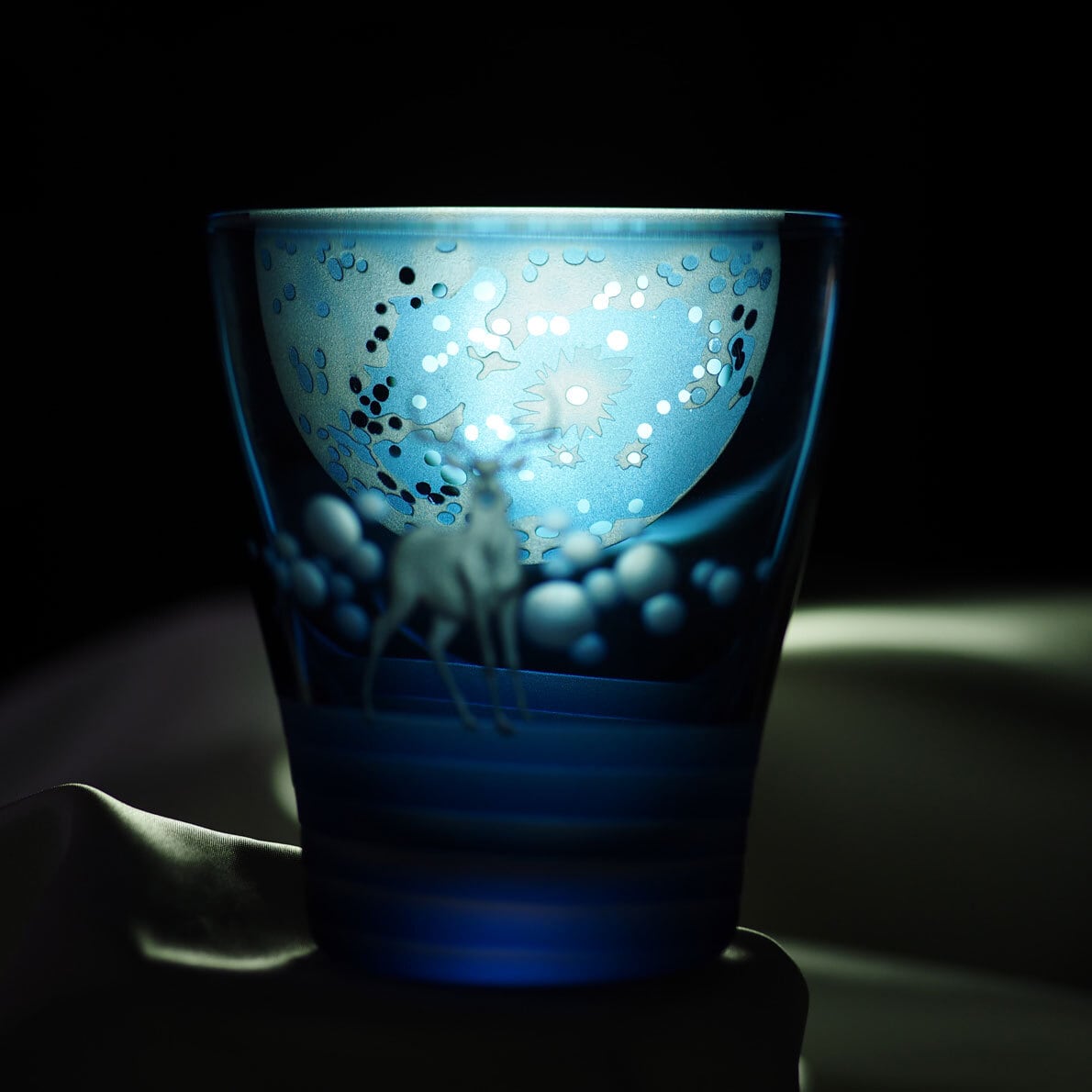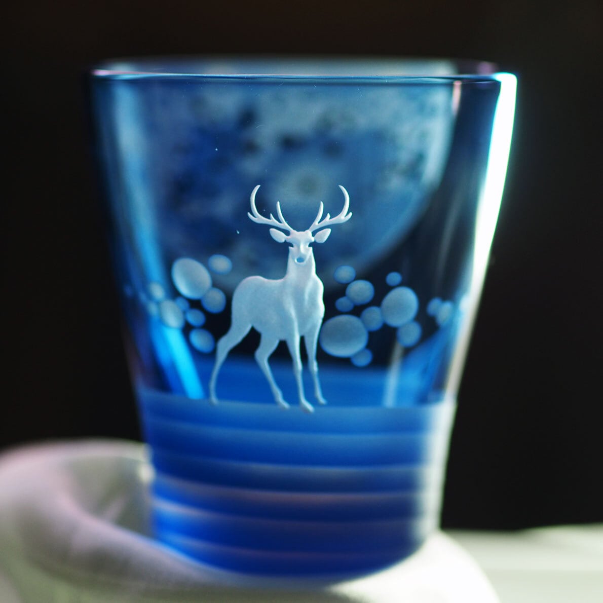 月夜に鹿が美しく佇む姿を描いた「あおによし」ロックグラス。幻想的なデザインが空間を演出し、お酒の時間を特別なものにしてくれます。この一杯で、日々の疲れやストレスを忘れ、リラックスした時間を過ごしませんか?