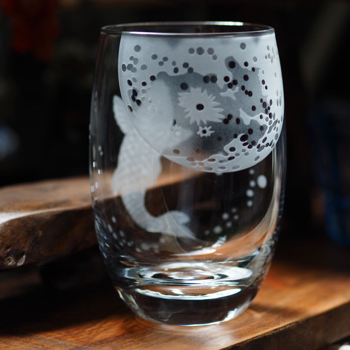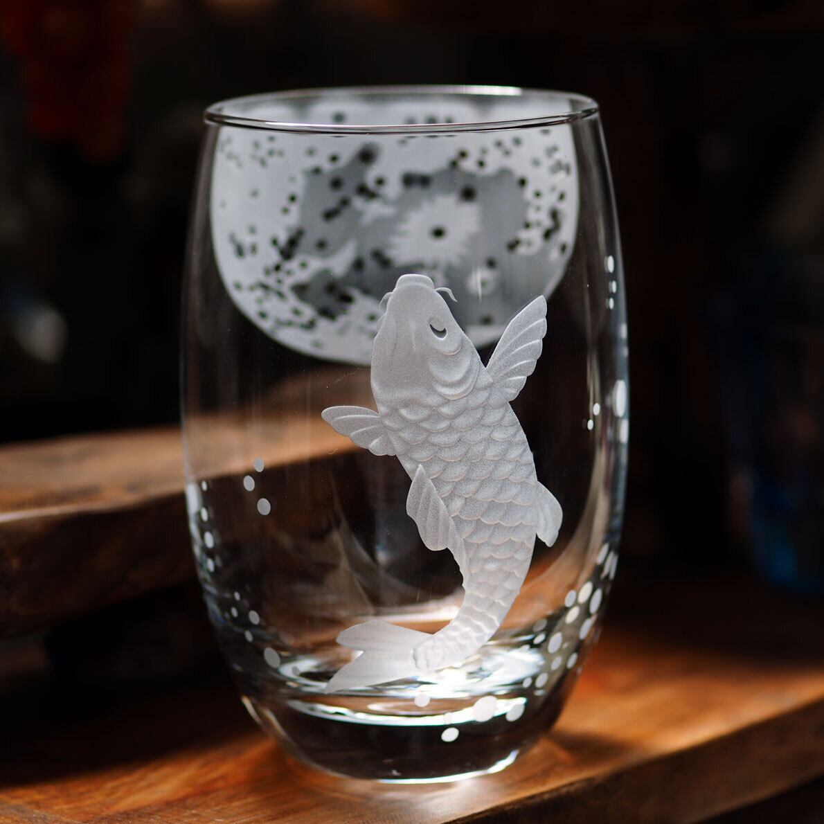サンドブラスト技術で彫刻された鯉が、まるで宇宙空間を泳いでいるような幻想的なデザイン。使うたびに心が癒されること間違いなし。